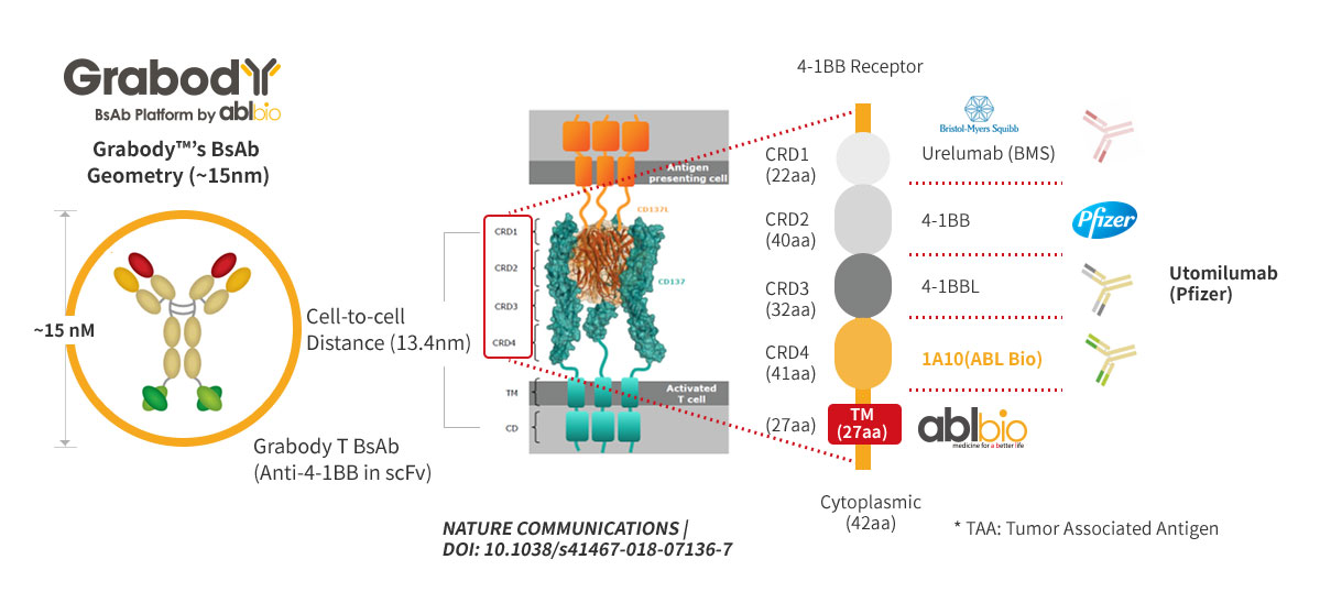 ABL의 Grabody™ T 플랫폼은 종양의 마이크로환경 내에 TAA가 출현한 상태에서 T세포를 활성화하도록 설계