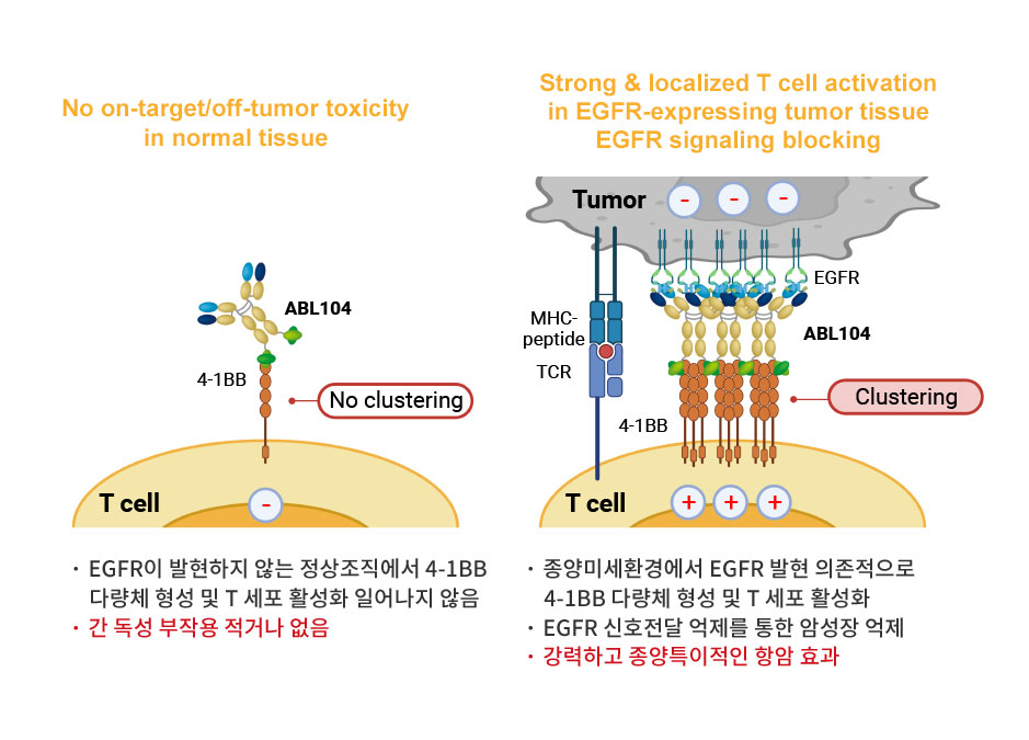ABL104 EGFR과 4-1BB를 타겟하는 이중항체입니다. 암에서 과다발현되는 EGFR 의존적으로 4-1BB 다량체 형성 및 T 세포 활성을 유도하여 강력하고 종양 특이적인 항암 효과를 보입니다. 이 외에도